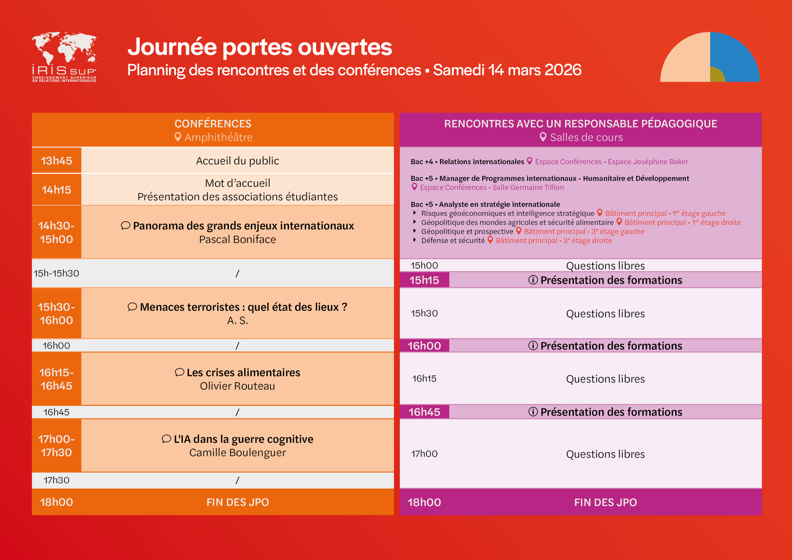 14h30–18h : Conférences, rencontres avec les étudiants et les alumni d’IRIS Sup’, ainsi qu’avec les intervenants des différentes promotions autour d’espaces de discussion.